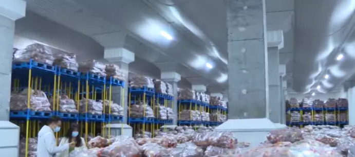 广东天拓冷链物流基地负责人 钟扬帆: 该冷库总共有六个冷库,一个库可以储存大概5-800吨的货物,总库容的话它可以放2万吨货物。